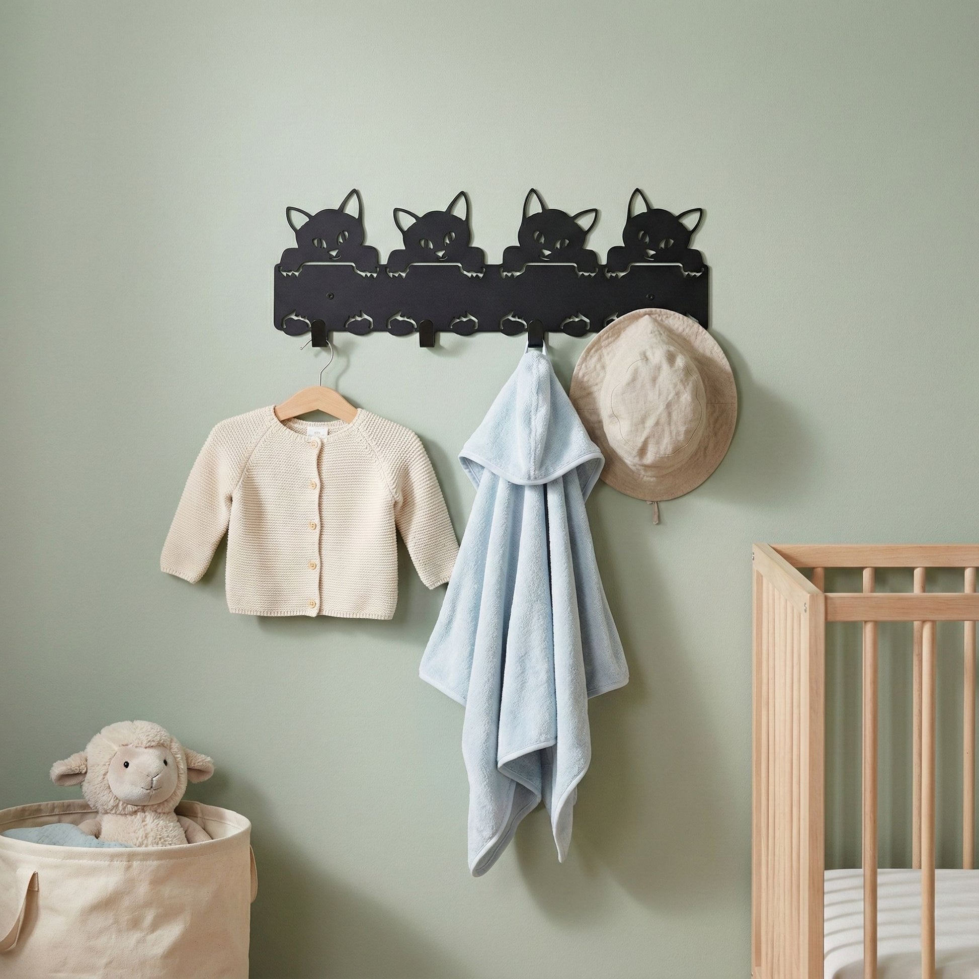 Kissanpennut naulakko yhdistää leikkisän ilmeen ja käytännöllisen säilytysratkaisun. Neljä suloista kissanpentua rivissä muodostavat siluetin, joka tuo kotiin lämpöä ja persoonallisuutta, ja samalla pitää arjen tavarat siististi järjestyksessä.