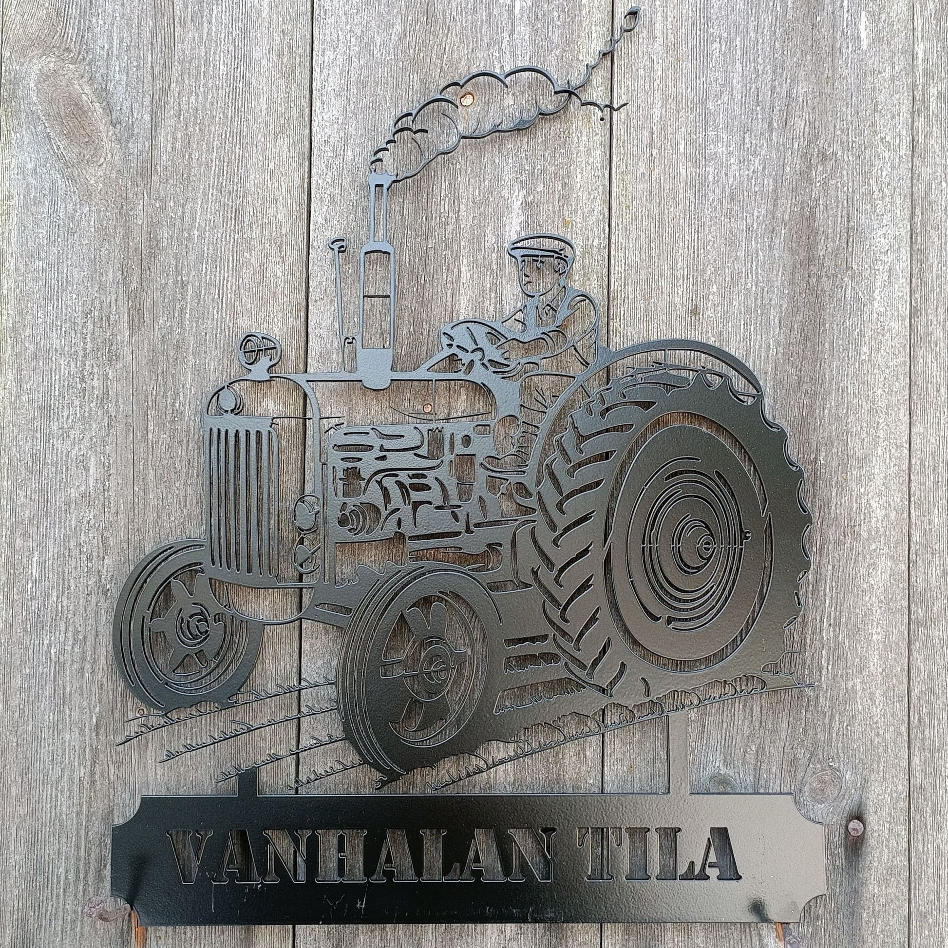 Vanha Traktori -metallikyltti tuo kotipihaan tai maatilan portin pieleen nostalgisen ja persoonallisen ilmeen. Kyltin perinteinen traktoriaihe ja yksityiskohtainen siluettileikkaus herättävät huomiota ja kertovat, että täällä on koneita, tarinoita ja historiaa.